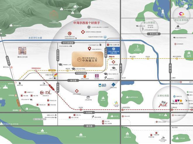 中海瑞文里位于石景山苹果园街道,西五环与阜石路夹角内,距离地铁6号线西黄村站约600米。6号线横向贯穿北京东西,早高峰30min可达金融街,40min到朝阳门。自驾经阜石路20min上四环,30min可触达中关村。板块内次新小区与成熟配套共存:北侧800米是山姆会员店,1.2公里是京西大悦城;首都医科大学附属北京康复医院、北大附石景山学校、首师大附属苹果园中学均在步行或骑行范围内。生活便利度与海淀北五环外相比,商业密度更高,城市界面更新。