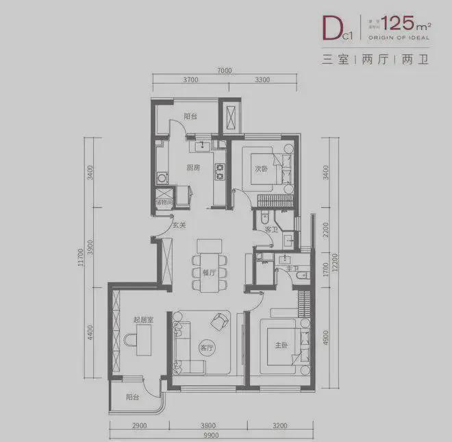 建面约125㎡是三室两厅两卫的户型!算了一下,主卧套房拥有约21㎡的空间,特别豪华!LDK餐客厨一体空间约46㎡,三代同堂同在客厅也不显拥挤!招待客人更显体面!