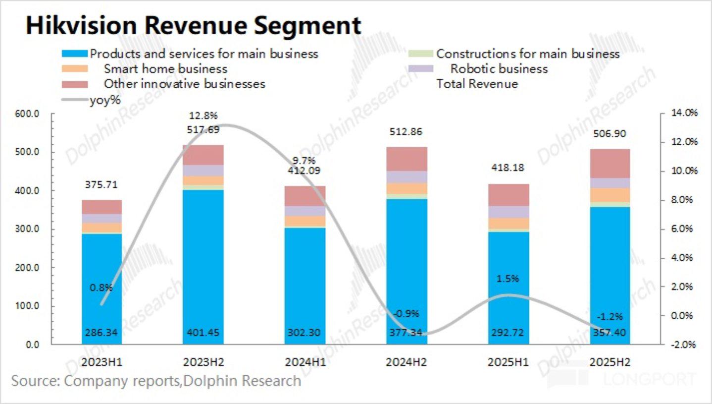 海康威视的主业产品及服务业务在 2025 年下半年实现营收 370 亿元,同比下滑 5.4%。受国内主业低迷的影响,再次陷入下滑。