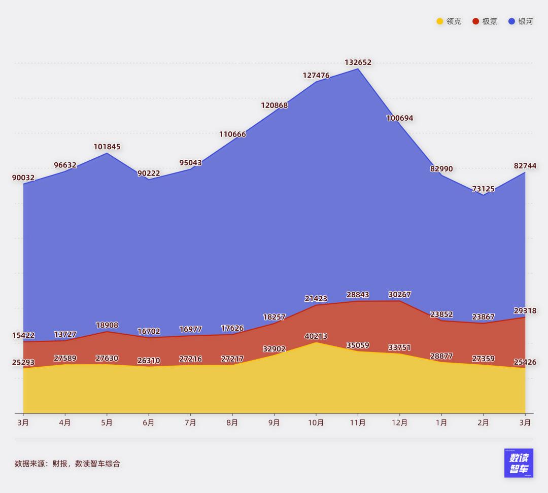 吉利是目前走得最稳健的车企。其格局主要"极氪+领克+银河",银河稳住基本盘,领克卡位中端,极氪进军高端。一季度,银河表现极为稳定,平均月销接近8万,已经是比亚迪王朝、海洋之下最强势的品牌,牢牢稳住了基本盘。