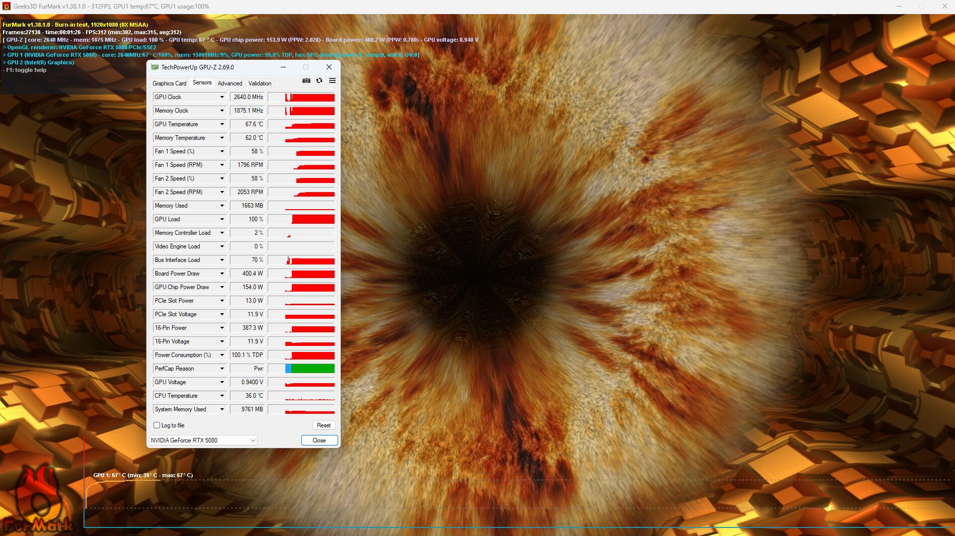 ▼跑甜甜圈测试的同时跑单烤FPU测试,模拟下整机满载情况,处理器功耗在230W左右,显卡功耗在400W左右。