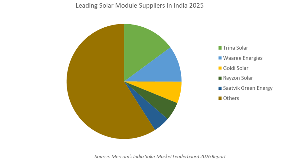 Mercom近日发布《2026年印度光伏市场排行榜》,明确了2025年印度光伏组件供应的头部格局——天合、Waaree Energies、Goldi Solar、Rayzon Solar和Saatvik Green Energy跻身前五,其中天合更是以15%的出货占比成为当年印度市场的领先供应商。