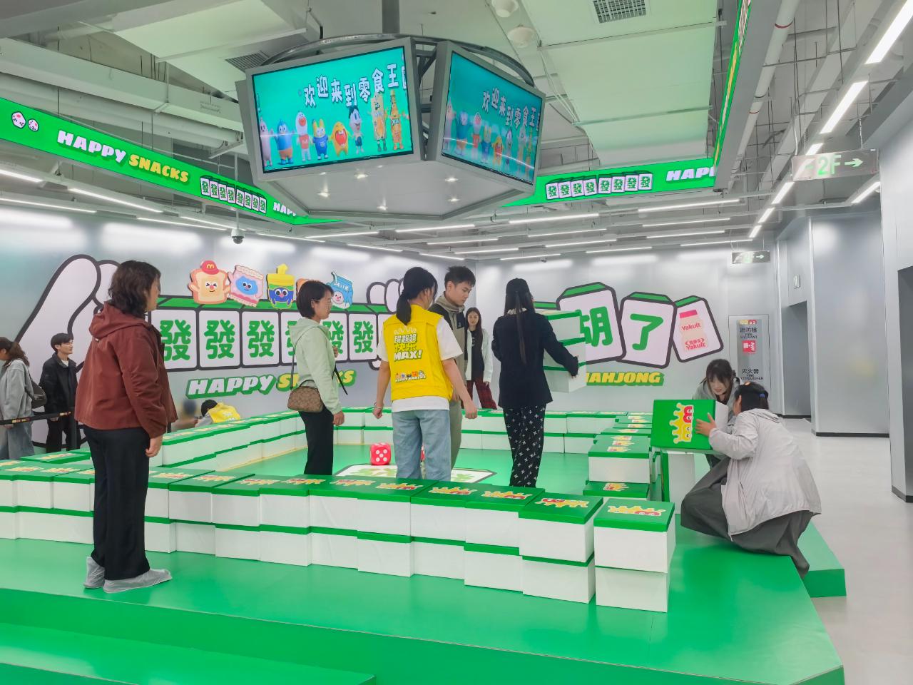 除了拍照外,各种互动游戏也成为一大亮点。在“雀神争霸赛”互动区域,为了能打一局“巨型麻将”,场外早已排起了长队。一人选牌,一人抱起丢入场中,打麻将变成了一个“体力活儿”。不仅场内激战正酣,场外也时不时响起观众支招的声音。
