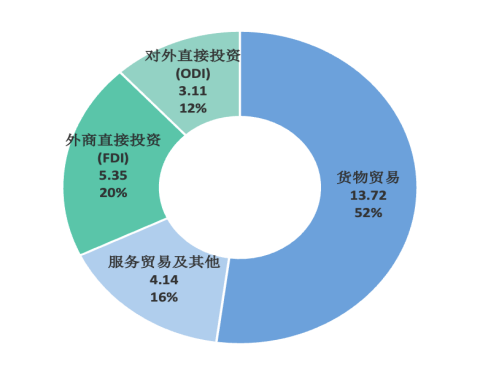 进入主题前,我们先看两张数据图表。从人民币跨境结算金额的结构来看,通常包括经常项下和直接投资两大类。目前,经常项下结算占比达到了总规模的67.9%,金额为17.86万亿元(见下图)。货物贸易仍在经常项下占主导地位,占比达52.1%,金额为13.72万亿元;与此同时,服务贸易及其他经常项目的占比正呈现出稳步上升的态势,目前已占总规模的15.7%,金额为4.14万亿元。