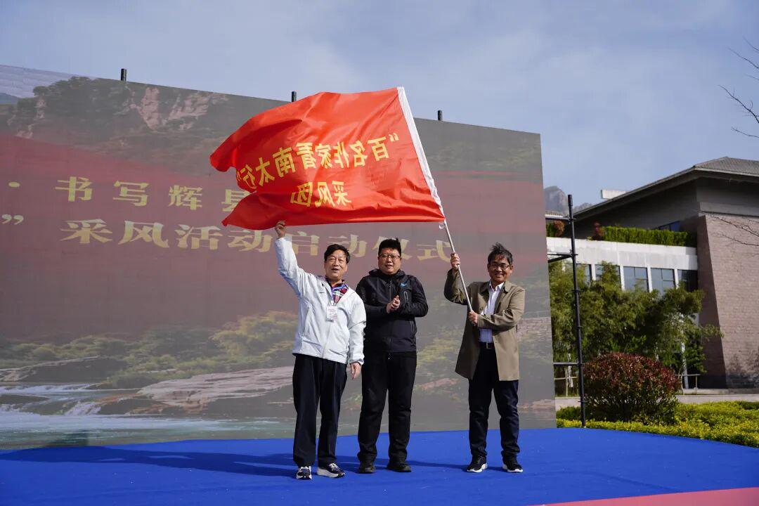 在采风团授旗环节,省散文学会副会长蔡云川为新乡南太行旅游有限公司授创研基地,中国作协全委会委员、河南省作协副主席赵克红与新乡南太行旅游有限公司经理狄林涛共同将“文学采风团”旗帜授予采风团代表、新乡市作协名誉主席赵文辉。旗帜飘扬,征程已启,这不仅是一份荣誉,更是一份沉甸甸的文化责任。