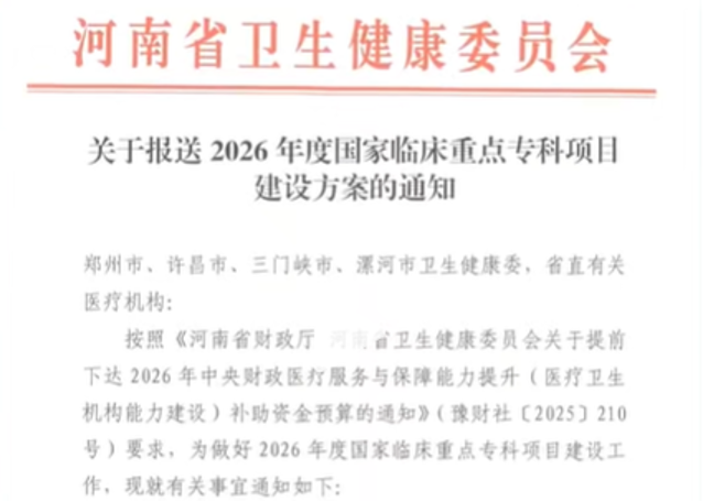 根据河南省卫健委发布的《关于报送2026年度国家临床重点专科项目建设方案的通知》,河南共有10个项目入选: