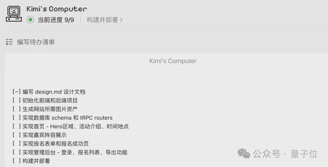 K2.6没有直接开始写代码。它先读了项目构建的技能文件,把任务拆成前端初始化、设计文档、后端架构、数据库schema等任务线,然后才开始动手。