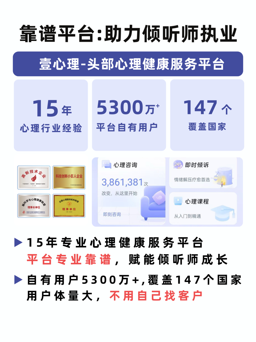 壹心理作为深耕心理服务15年的专业平台,自有用户5300万,用户覆盖147个国家。