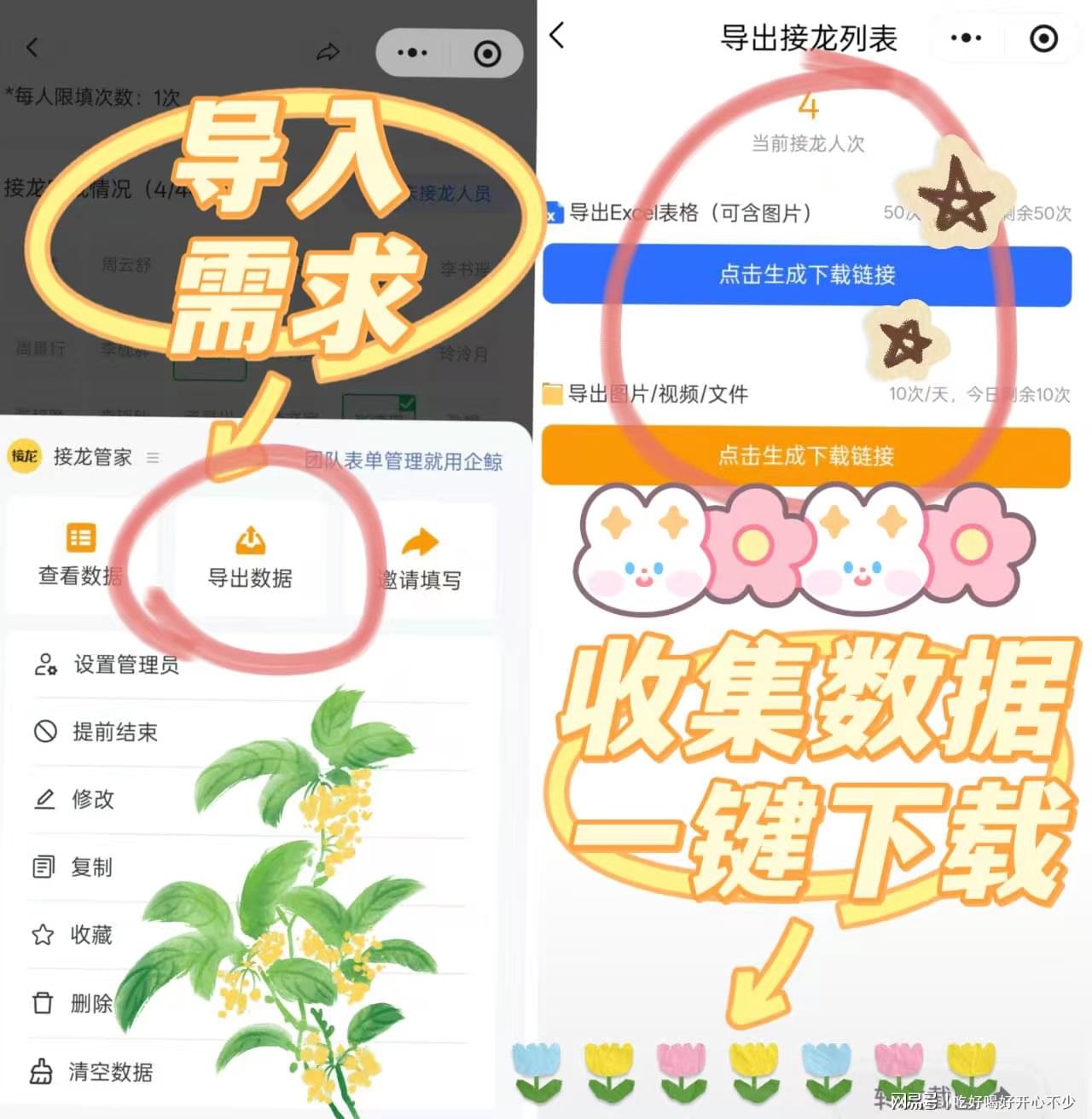 这些事,用接龙管家就能轻松搞定:一条接龙下发通知、收集同学信息,它会自动统计汇总,还能一键导出,不用手动汇总浪费时间,省下来的时间可以留给自己。