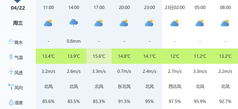 今天是2026年4月22日,武汉白天天气为小雨,北风微风,夜晚天气为多云,北风微风,最高气温15℃,最低气温11℃,空气湿度92%,体感温度9.5℃,空气质量优。雨天道路湿滑,出行请携带雨具,注意防滑,驾车保持安全车距。