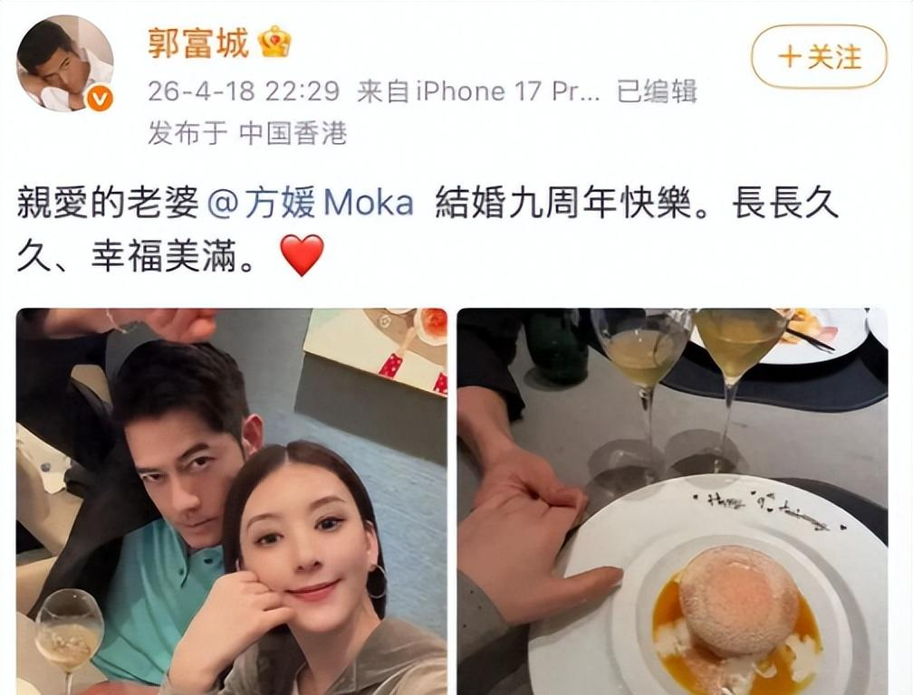 4月18日那天,郭富城率先在微博发了合照,配文就是简单的结婚九周年快乐,长长久久。照片里59岁的郭富城真的看不出年纪,穿得简简单单休闲装,头发梳得利落,脸上连明显皱纹都没有,还是当年那个帅天王。36岁的方媛依偎在他肩头,妆造温柔气质甜,两个人对着镜头的眼神全是默契,甜度都快溢出屏幕了。