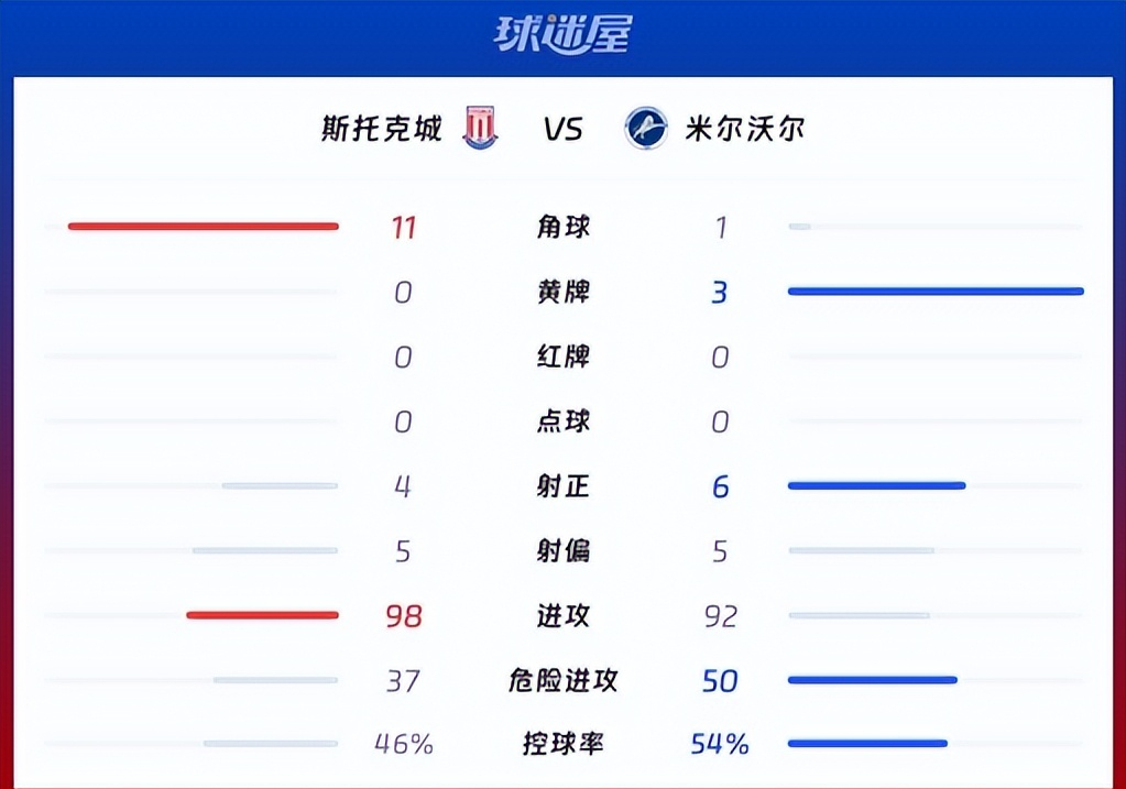 这场比赛诞生英冠赛场极具反差的数据。斯托克城全场拿下 11 个角球,远超对手的 1 个,进攻次数 98-92 领先,仅完成 4 次射正。米尔沃尔全场 54% 的控球率,6 次射正打入 3 球,用极致进攻效率拿下客场胜利,送给对手主场失利。