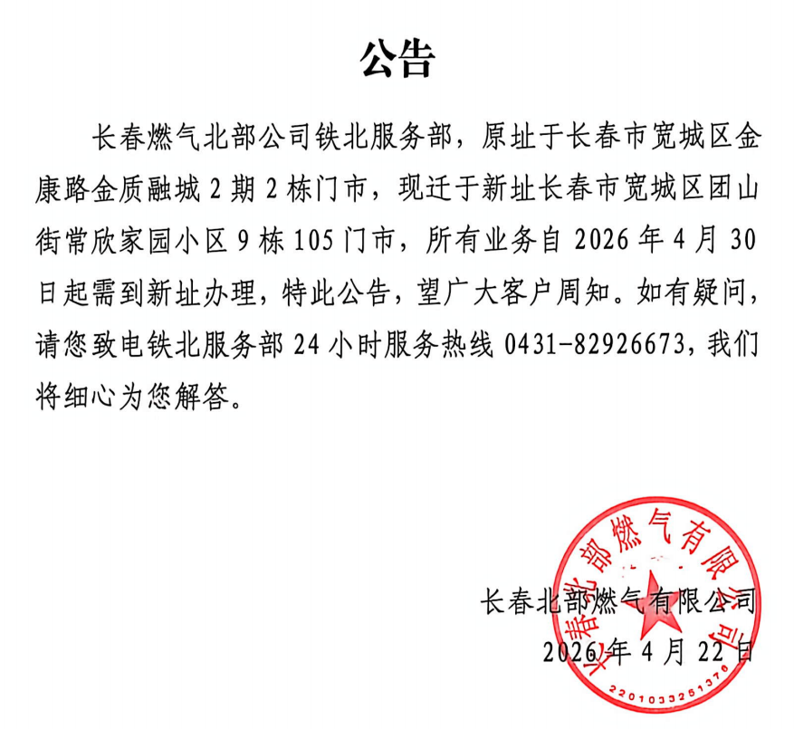 长春燃气北部公司铁北服务部迁址公告 吉刻新闻 2026-04-22 16:29 ·吉林 ·中国吉林网官方网易号 打开网易新闻 查看精彩图片 来源:中国吉林网综合自长春燃气微信公众号编辑:刘星彤 审校:张楠主编:曲翱 监制:陈尤欣统筹:张燕 打开网易新闻 查看精彩图片 点喜欢