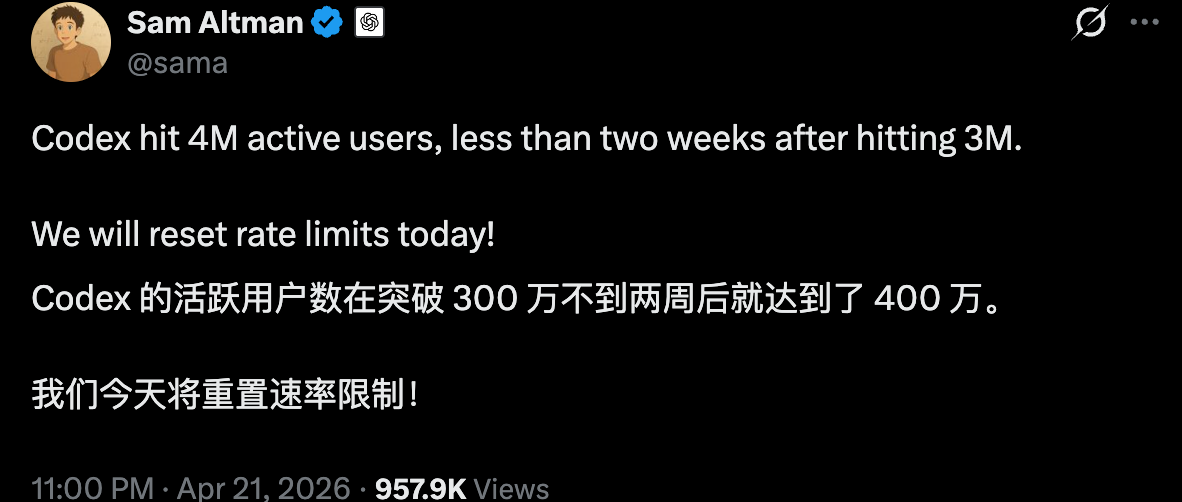 今天,Codex 负责人和奥特曼再发推文,表示不到两周 Codex 增加了 100 万新用户,为了庆祝这件事,Codex 的速率限制又又又重置了。