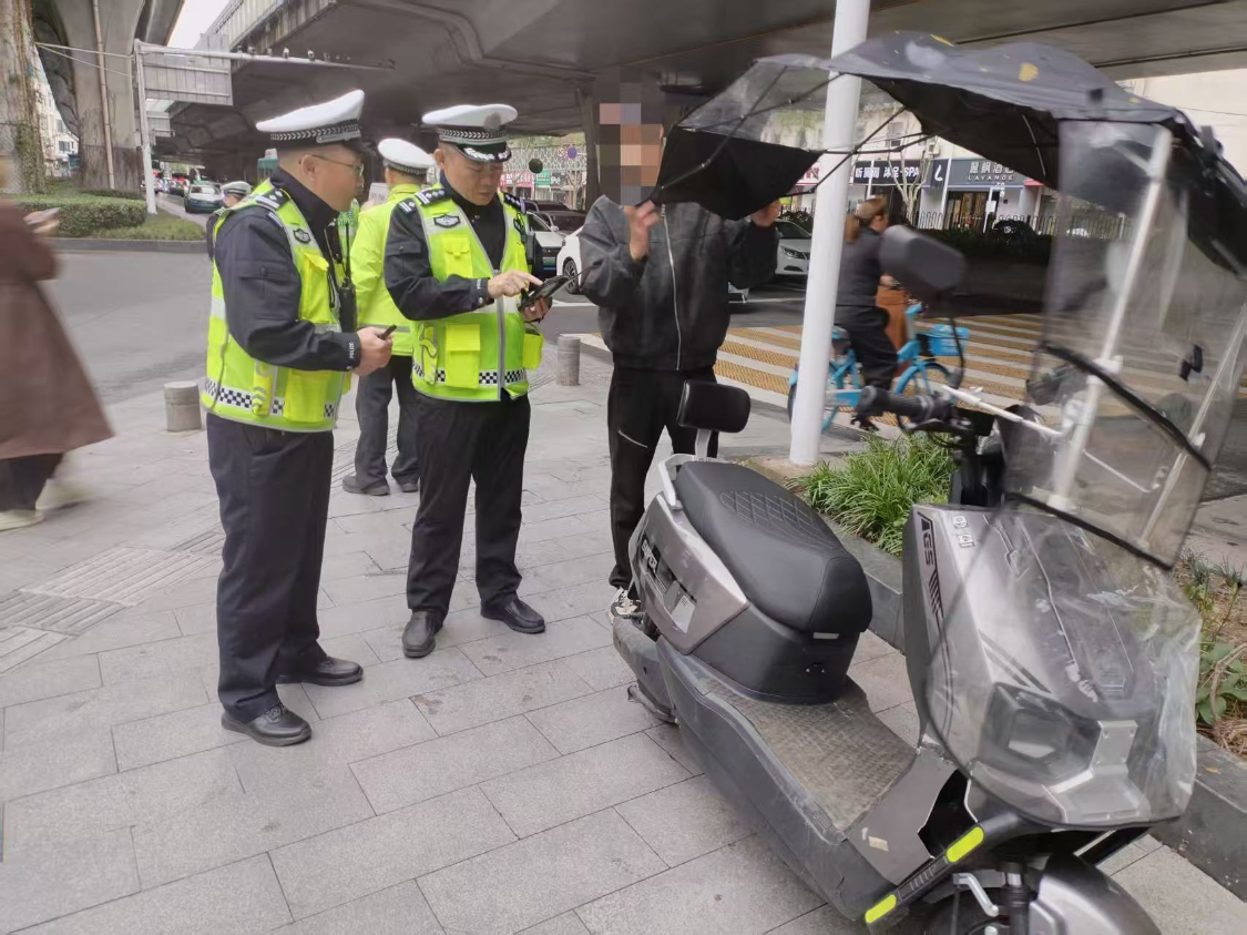 整治当日,江汉交管大队副大队长胡敏带队在发展大道常青路口开展整治,该路口紧邻汉口火车站,人流车流密集,电动自行车违法较为突出。10时许,胡敏在路口发现一辆加装雨棚的电动车,车辆行驶时摇摇晃晃,存在极大安全隐患。民警当即示意其靠边停车,没有严厉斥责,而是结合近期涉电动车事故案例,耐心讲解加装雨蓬的危害,强调安全骑行的重要性。随后,当事人现场配合民警拆除了雨蓬,并承诺今后一定规范骑行。