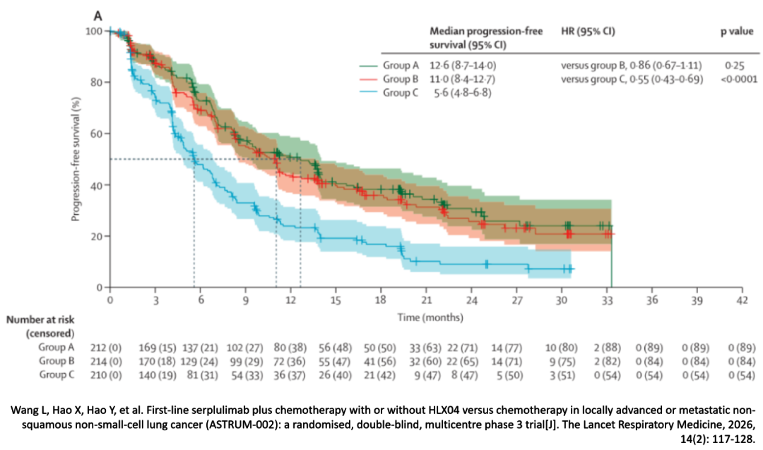 [5] Wang L, Hao X, Hao Y, et al. First-line serplulimab plus chemotherapy with or without HLX04 versus chemotherapy in locally advanced or metastatic non-squamous non-small-cell lung cancer (ASTRUM-002): a randomised, double-blind, multicentre phase 3 trial[J]. The Lancet Respiratory Medicine, 2026, 14(2): 117-128.