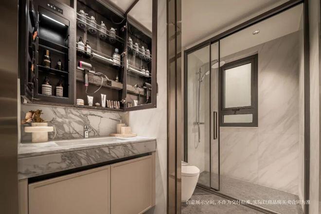 - 尤其是卫生间的镜柜,使用了内外双镜,并且内部的收纳空间相当丰富,小到女主人的发箍、面膜、口红、香水,大到吹风机都有适合的位置。