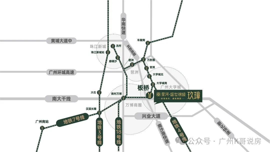 地段,始终是房产价值的核心底层逻辑。星河·盛世锦城坐落于广州番禺万博板块核心区位,地处南大干线经济带的番禺黄金财智走廊,是广州城市南拓的核心发展板块,更是连接珠三角东西岸的重要发展节点。项目处于万博、琶洲两大世界级商圈的双重辐射范围内,同时位于广深港澳科技走廊、广州科技创新轴、南大干线经济带三大科创发展轴的交汇之处,板块发展能级不言而喻。周边区域汇聚了番禺1900余家高新技术企业,包括希音、欢聚时代、迪士普等行业龙头企业,大量高收入、高知的科创人才汇聚于此,为板块发展提供了强劲的人口支撑与经济动力。随着南大干线的全线通车、万博CBD的持续扩容,板块的价值还将持续攀升,无论是自住的生活便利性,还是资产的保值增值能力,都有着坚实的支撑。