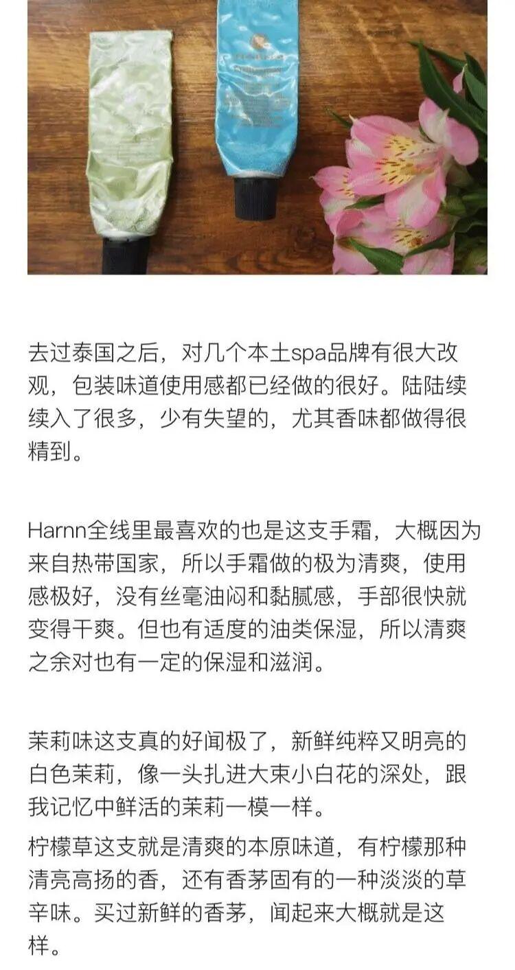 它的茉莉花香太美了,很灵很鲜且很纯正。很多人都在苦苦寻找纯正的茉莉香水,后来我发现即使再贵的香水,统统不如Harnn一支护手霜那么像真花。