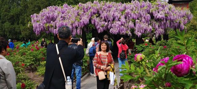 花间小径上,不少游客特意身着唐装、汉服,衣袂翩然,穿行于花影之间,或执团扇轻倚花枝,或与友人笑谈留影,摄影师们按下快门,定格下一幅幅“人在画中游”的古典画卷。红墙黛瓦为背景,牡丹为衬,恍若穿越千年,与古人共赴一场春日花事。