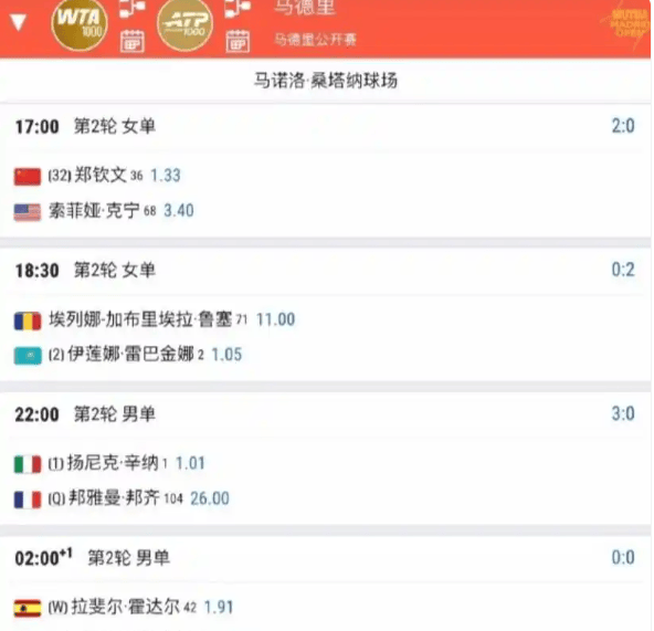 马德里红土场的夜风还带着凉意,WTA1000第二轮却已掀起惊涛骇浪。萨巴伦卡13连胜稳如老狗,斯瓦泰克横扫对手轻松晋级,7号种子斯维托丽娜却成首位翻车大种子——但最让中国球迷揪心的,是郑钦文:世界排名掉到30开外,却稳稳坐在中心球场首秀的C位。