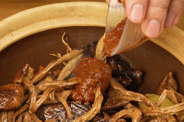 3.加半勺豆瓣酱、半勺松茸黄豆酱、适量蚝油、松茸一品鲜和松茸调味料,翻拌均匀,加泡菌菇的水