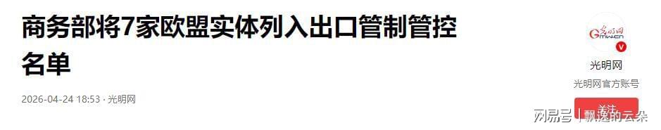 4月24日,商务部准时发布2026年第20号公告,正式宣布将比利时、德国、捷克三国的7家实体列入出口管制管控名单,一口气亮出反制底牌。