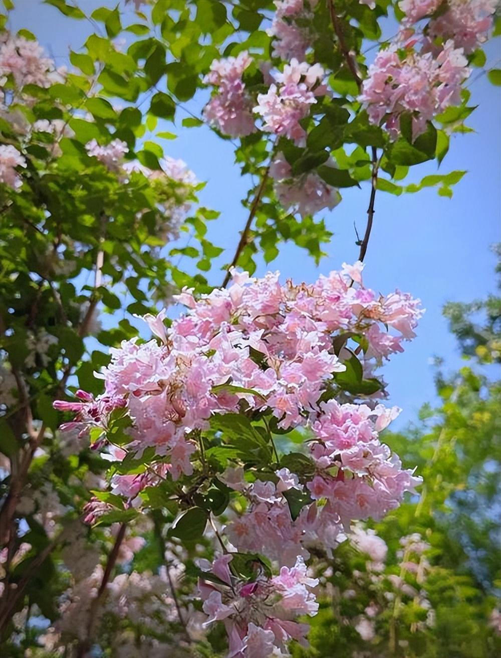 这种直立灌木最高可达3米,满缀粉红色的花簇呈拱形自然下垂延伸,绿叶藏于花间若隐若现。远观它就如同一座逐浪嬉戏的喷泉,形成天然的拱洞长廊,分分钟把人拽入二次元童话风-,尤其适合人树合影,衬得人比花更娇美。