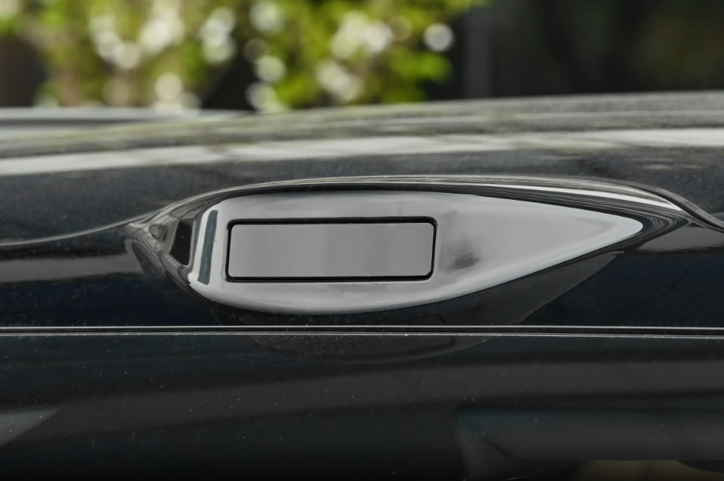 车侧就更显大气了,高大挺拔,腰线很柔顺,车顶线条也做得比较平直,保证了车内头部空间。车窗线条笔直,再配上一圈镀铬装饰,豪华感直接拉满。轮毂用的是这种偏商务豪华的“大饼”样式,看着稳重又上档次。门把手是隐藏式的,侧面更简洁,在前翼子板位置还能看到银色的传感器,科技感也没落下。