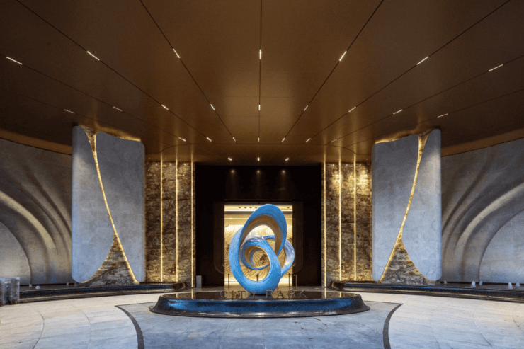 独创双桥跨水归家系统,3米宽人行桥与7米宽车行桥平行横跨约400米水岸,彻底实现人车分流;步行过桥直达约9米挑高、36米宽鎏金门庭,整面天然奢石背景墙搭配定制艺术雕塑,两侧点缀景观绿植。