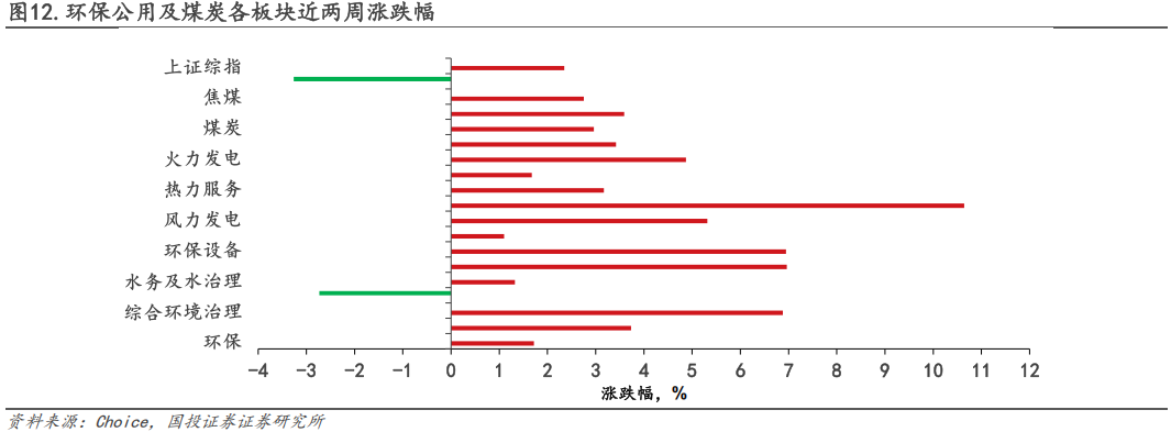 4月11日-4月24日,从细分子行业来看,环保板块中,固废治理板块下跌2.73%,水务及水治理板块上涨1.06%,大气治理板块上涨6.96%,环保设备板块上涨6.94%,环境综合治理板块上涨6.88%;公用事业板块中,火力发电板块上涨4.87%;水力发电板块上涨1.67%,风力发电板块上涨5.32%,光伏发电板块上涨10.64%,燃气板块上涨1.1%,热力服务板块上涨3.17%,电能综合服务板块上涨3.42%。