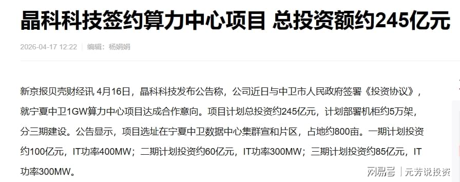 算电协同:公司近日与中卫市人民政府签署《投资协议》,就宁夏中卫1GW算力中心项目达成合作意向。项目计划总投资约245亿元,计划部署机柜约5万架,分三期建设。公司主营业务为新能源电站投资运营,已与腾讯、阿里等头部互联网企业合作打造数据中心微电网等低碳能源解决方案,并积极布局和组织申报绿电直连项目。公司将依托自身在新能源发电优势,项目建成后直接绿电直连。
