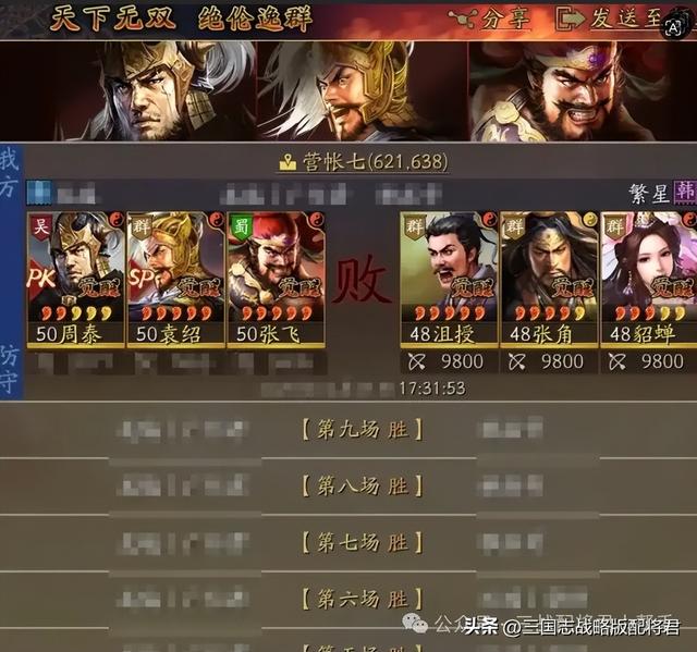 三战张飞又一套高胜率“军神盾”火了!在遍地弓兵队伍居多的九州剧本中,最高冲上了全服战功前5的位置,强度丝毫不逊属于张飞“熊烈盾”和“网红骑”,出门基本上都能做到把把强势的连穿,只要接战也是频繁拉横幅!最关键的还是在于“治·抚辑军民”类似于加强后的军民战法,非常契合周泰张飞SP袁绍的队伍组合,加上盾兵克制弓兵阵容的优势,从而大大的提高了队伍连穿的胜率,兄弟们抓紧组起来玩!