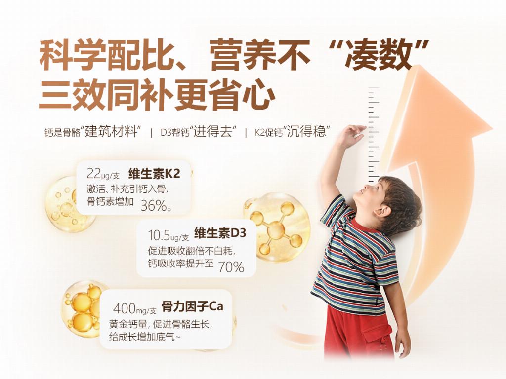有机钙+专利D3+专利K2(MK-7)科学闭环,补钙效果突出,归一食纯配方保留全部活性营养。专利D3促进钙结合蛋白合成,减少钙排泄;专利K2激活骨钙素,引导钙沉积入骨,防止血管钙化。长期饮用可改善生长迟缓,调理骨骼功能,适配生长冲刺儿童、挑食偏食孩子、饮食不规律学龄童,温和无副作用。相较于其他液体钙,它的营养更易被人体吸收,空腹服用也不会对肠胃造成任何刺激。