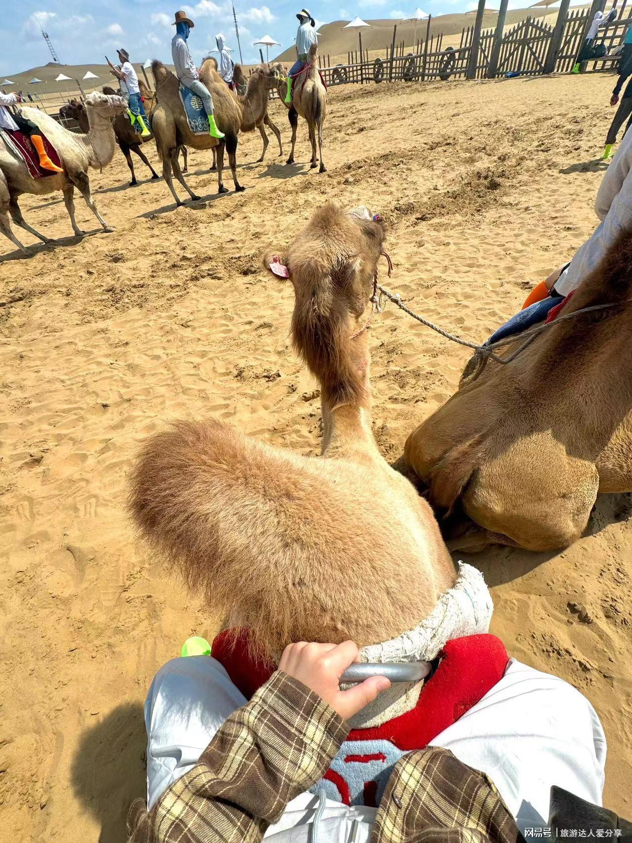 第三天:响沙湾沙漠,玩沙冲浪乐翻天。离开草原,我们驱车前往鄂尔多斯境内的响沙湾。朵朵提前一天就在车上教我们沙漠防沙小技巧:把手机装在密封袋里,帽子要系带子,鞋套提前租好。到了景区,她熟练地帮我们核销了套票——响沙湾的门票+索道+沙漠冲浪车+骑骆驼的联票,成人280元,孩子半价,比单买省了将近100元。孩子们一进沙漠就疯了,从沙丘上滚下来,趴在沙子里打滚。朵朵全程陪着他们堆沙堡,教他们认识沙漠里的蜥蜴和植物。中午我们在沙漠里的“月牙餐厅”用餐,朵朵推荐了沙葱炒蛋和骆驼肉馅饼,味道独特又不贵,四个人吃了120元。下午的骑骆驼环节,朵朵提前帮我们选了几头性格温顺的骆驼,还细心地教孩子怎么握缰绳。她自己的嗓子已经有点哑了,但讲解沙丘形成的知识时依然清晰有力。傍晚入住鄂尔多斯市区的酒店,朵朵帮我们推荐了一家当地人常去的烧麦馆,皮薄馅大,一笼才25元。这一天的自费主要是晚餐和景区内买的一杯蒙古酸奶,共100元。朵朵在酒店大堂帮我们整理明天的行程,叮嘱我们成吉思汗陵不能拍陵包内部,尊重文化习俗。