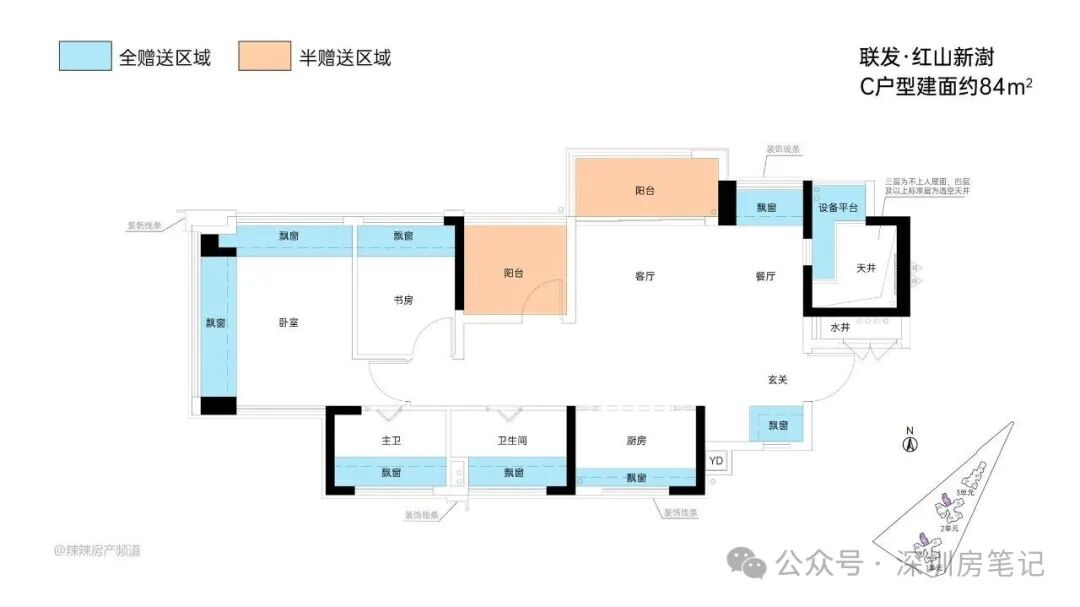 这是红山板块上车门槛最低的三房户型,采用竖厅LDKG+X格局设计,客厅3米开间,S墙设计预留冰箱卡槽位,三开间朝南,动静分区。主卧带双飘窗,U型大厨房,厨房烟道外置设计释放更多操作空间,卫生间三段式干湿分离。赠送双阳台一半面积加5面飘窗加1个设备平台,得房率超100%,空间极致利用,是刚需客户上车的首选。