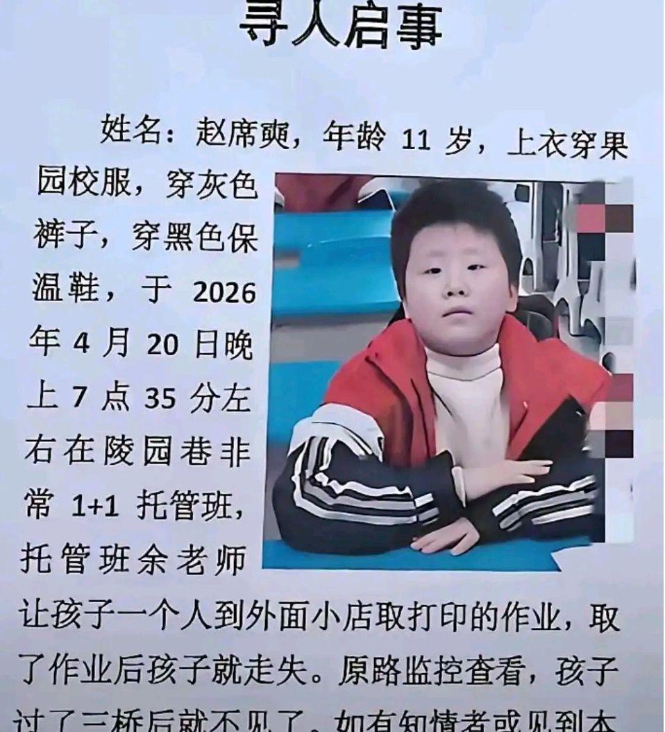 4月28日,陕西安康11岁男孩赵席奭失联已经8天了。4月20日晚上7点35分左右他从托管班去附近商店取打印的作业,拿到后却没有回托管班,而是走向了相反方向。