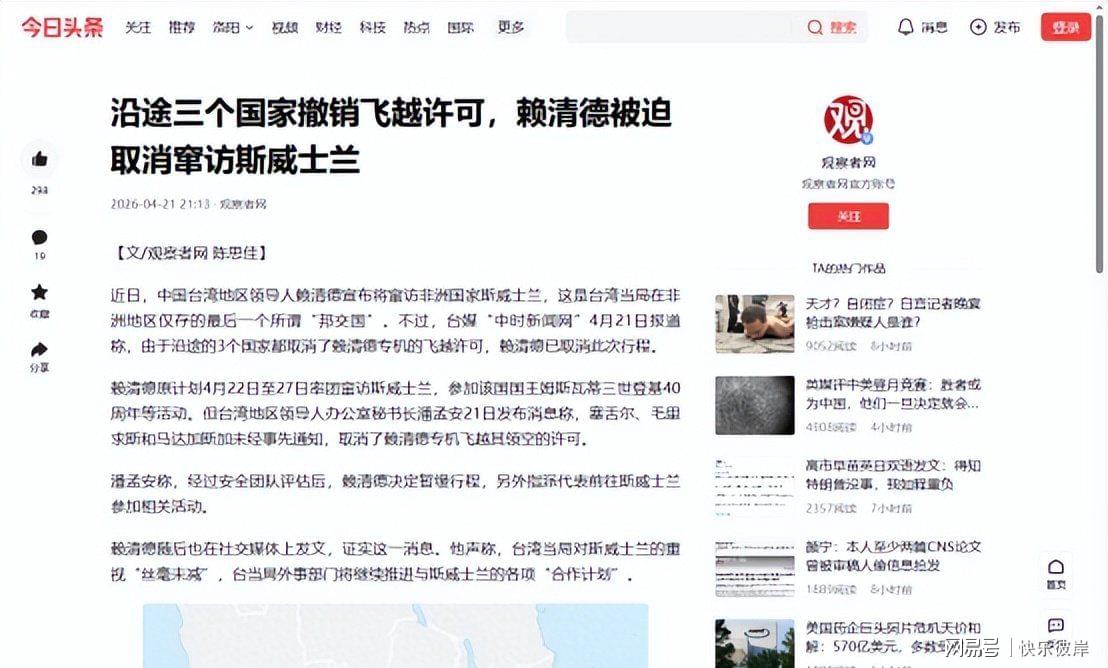 2026年4月,台湾方面原本安排的一次对外出访,在还没真正启程前就被迫取消,计划是让赖清德前往非洲的斯威士兰,参加当地国王登基40周年活动,借这个机会做一波所谓“国际曝光”,展示对外联系。