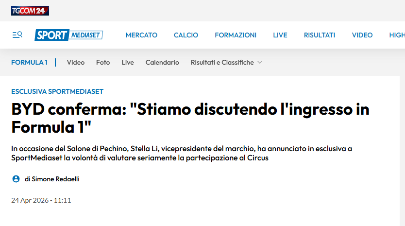 4月26日,比亚迪执行副总裁李柯在北京车展期间向意大利媒体证实,公司正就进军F1赛事展开实质性洽谈,已与F1总裁兼CEO斯特法诺·多梅尼卡利会面。这是比亚迪官方首次公开承认这一计划。记者注意到,从足球到F1,比亚迪的“体育出海”战略正向纵深推进。