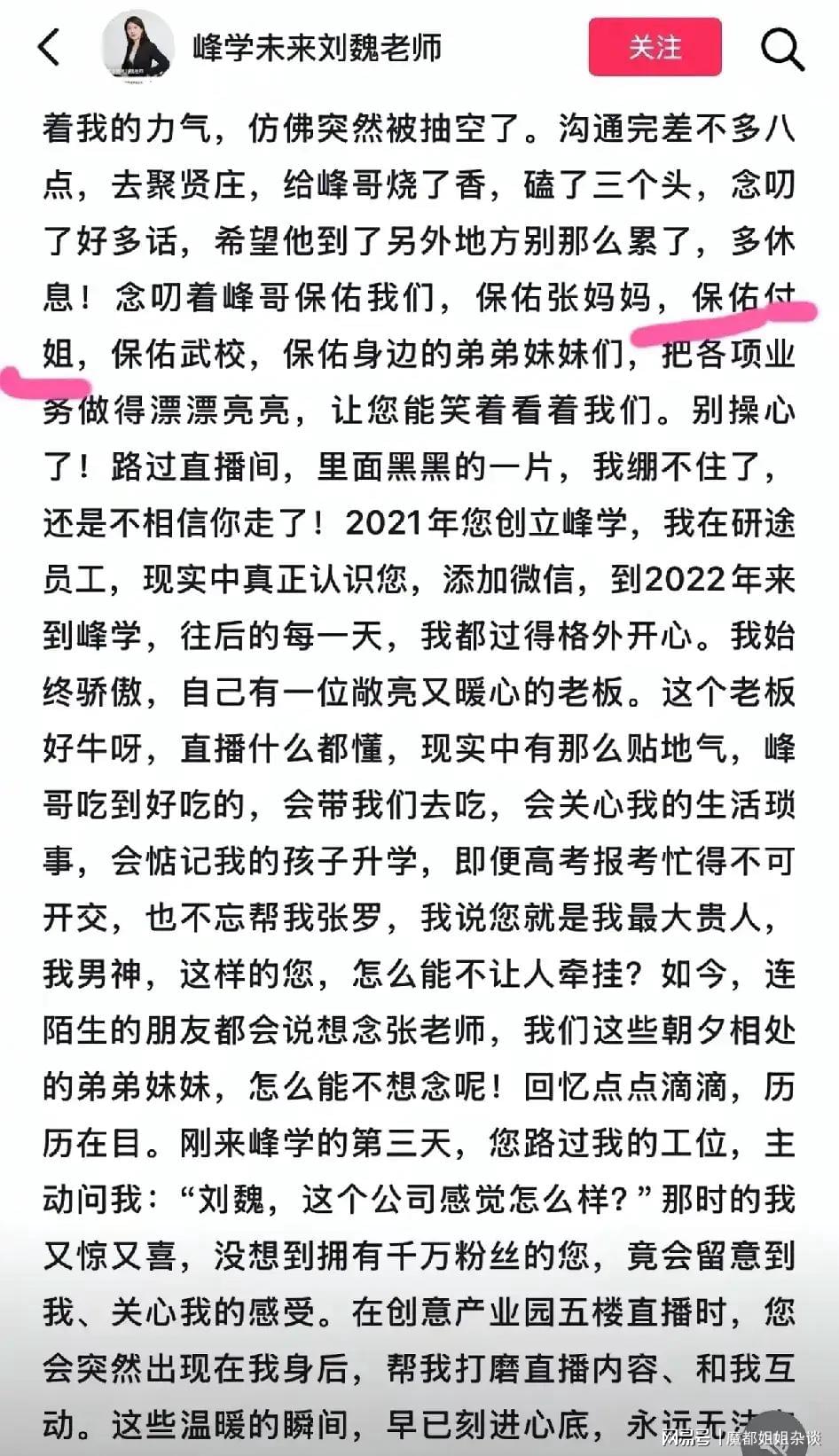 峰学未来刘魏老师发文,保佑张妈妈,保佑付姐,保佑武校,却没有提及张雪峰的唯一的女儿张姩菡。