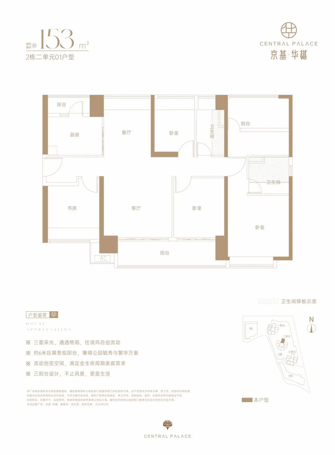 仅2栋2单元05户型才有,设计的是经典竖厅格局,LDKB一体化,动静分区,四开间朝南,U型厨房,卫生间干湿分离,得房率约73%(不含赠送),阳台西南朝向。