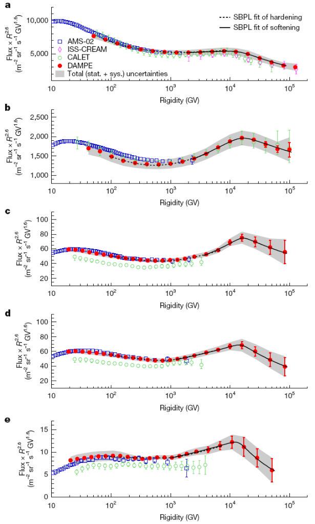 a至e为“悟空”测量的质子、氦、碳、氧、铁核能谱(图中红点)和其他实验结果对比。研究显示,5种粒子存在统一的能谱“鼓包”结构。(暗物质粒子探测卫星“悟空”国际合作组供图)