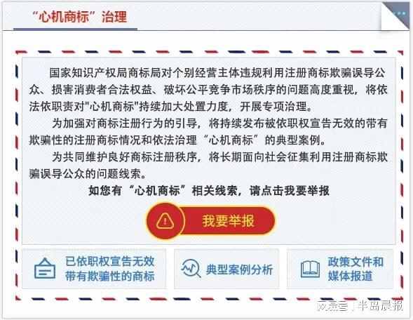 国家知识产权局副局长芮文彪近日在国新办发布会上表示,对“心机商标”问题,正在采取有力措施进行专项整治。记者注意到,国家知识产权局商标局中国商标网已上线“心机商标”治理版块。