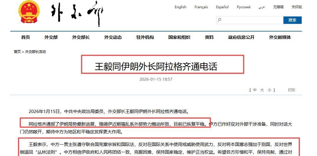 外交部:《王毅同伊朗外长阿拉格齐通电话》2026年1月15日抖音短视频:《@湖北日报——美媒:特朗普暂缓对伊朗动武决定,同日美国宣布对伊朗实施新制裁。》2026年1月16日抖音短视频:《@参考消息——白宫发言人:特朗普“暂缓”对伊朗动武 正密切关注局势》2026年1月16日