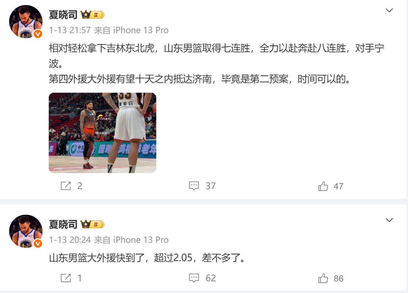 据最新消息,这3名外援已经与山东男篮正式签订本赛季合同,意味着他们将顺利代表山东男篮征战本赛季剩余的比赛。而球队的第四外援则议论纷纷,1月17日上午9:04,山东男篮第四外援迎来最新进展。据山东知名媒体记者夏晓司在社交媒体发文透露,山东男篮第四外援也是大外援的进展顺利,办理手续、签证、航班行程的时间已基本确定,具体情况等待俱乐部官宣。