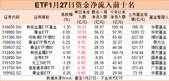 Wind数据显示,1月27日,华夏有色金属ETF基金单日资金净流入16.57亿元,位居全市场非货ETF榜首。华安黄金ETF、可转债ETF博时资金净流入也均超10亿元,分别为12.93亿元、10.88亿元。