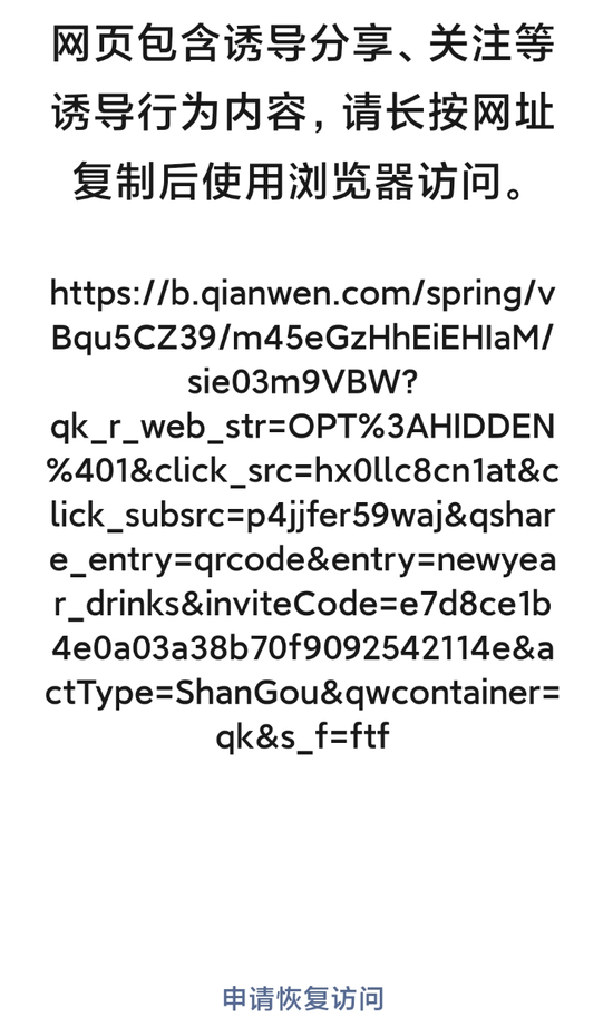 值得注意的是,继微信封杀自家腾讯元宝、百度文心助手后,千问的红包分享链接也被微信屏蔽,页面显示网页存在诱导或误导下载/跳转的内容,需要跳转第三方浏览器访问。同时,部分用户在千问APP点击分享活动至微信好友时,已自动改为复制口令形式。