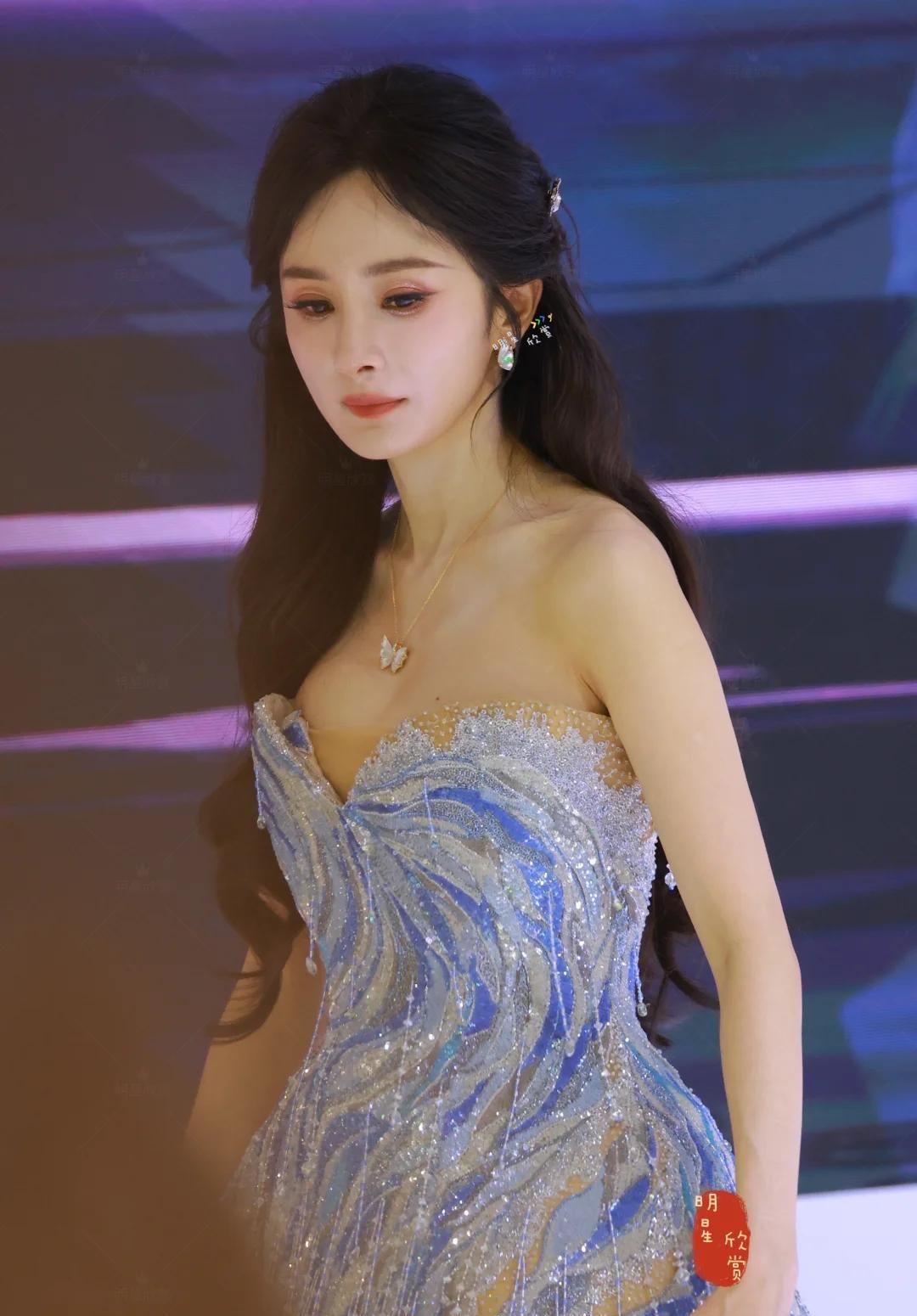她本次选择的是印度国宝级设计师Rahul Mishra 2026春夏高定系列的双层叠搭造型:上身采用蓝银渐变珠绣流苏抹胸设计,下装则配以蓝紫晕染薄纱曳地长裙。单论创意构想与工艺复杂度,这套组合堪称华语娱乐圈罕见的大胆尝试,亦刷新了国内艺人公开活动中高定单品叠加数量的纪录。