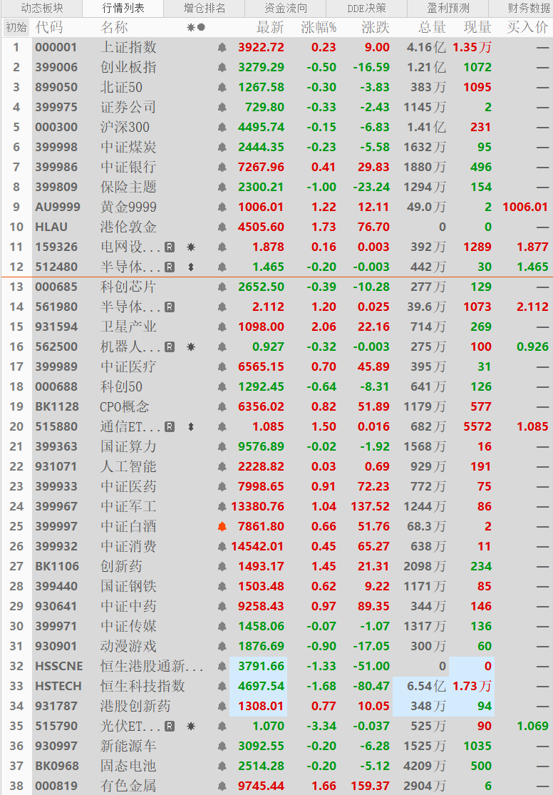 周一两市低开高走,截止午间收盘,盘面上黄金有色、资源、半导体设备、卫星、军工、创新药、农业、CPO通信等上涨,北证50、煤炭、保险、半导体、港股恒生科技、光伏、新能源车电池等下跌,两市跌多涨少,赚钱效应一般。