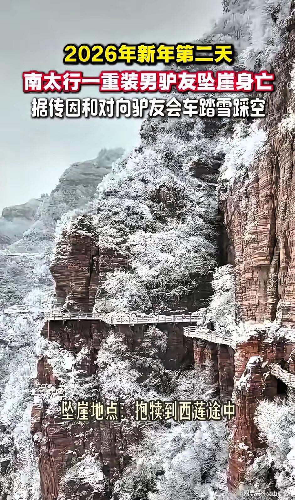 事发2026年1月2日下午14时30分,在河南新乡南太行“抱犊至西莲未开发户外徒步路线”发生一起驴友坠崖事故。